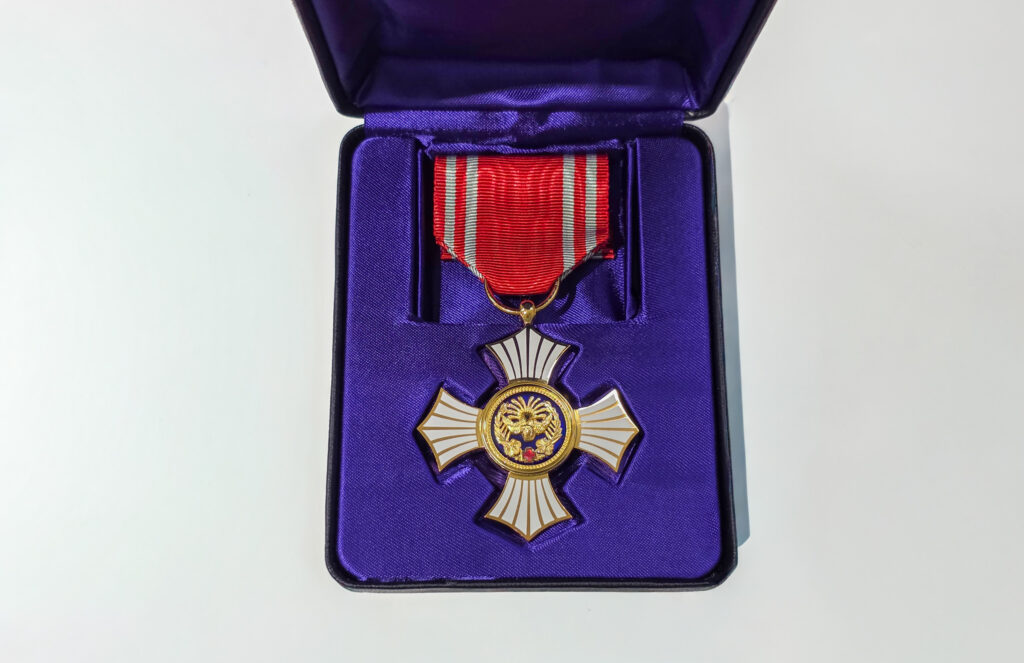 「金色有功章」は日本赤十字社が設けている表彰制度の一つで、一定額の活動資金を納めた功労者などに贈られる章です。